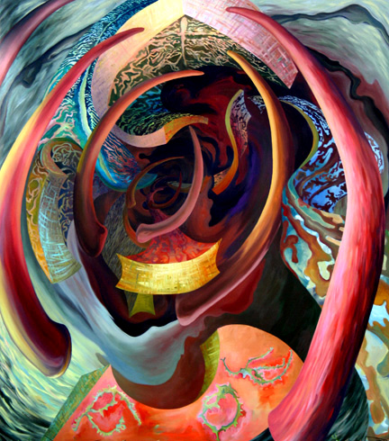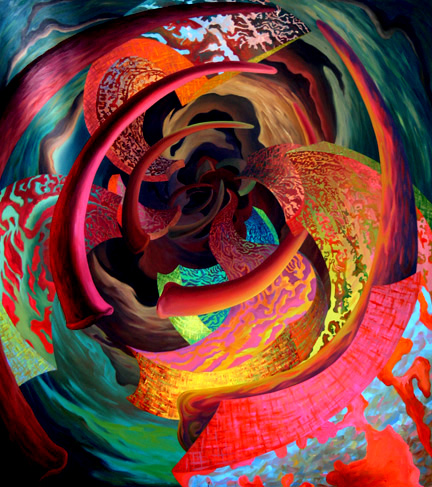 Internal Medicine explores deep space and hot color. The intricate patterning within the planes comes from the "hieroglyphs" made on trees by bark beetles. The marks seemed like a language to me.